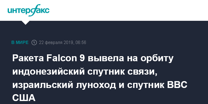 Москва. 22 февраля. INTERFAX.RU - Американская ракета-носитель Falcon 9, стартовавшая с космодрома на мысе Канаверал (штат Флорида) в пятницу, вывела на орбиту индонезийский спутник связи, израильский лунный посадочный модуль с луноходом, а также спутник в интересах ВВС США, сообщила компания-разработчик ракеты SpaceX.