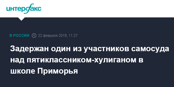 Москва. 22 февраля. INTERFAX.RU - Правоохранительные органы задержали одного из участников инцидента в школе города Большой Камень в Приморье, где родители учинили самосуд над пятиклассником-хулиганом.