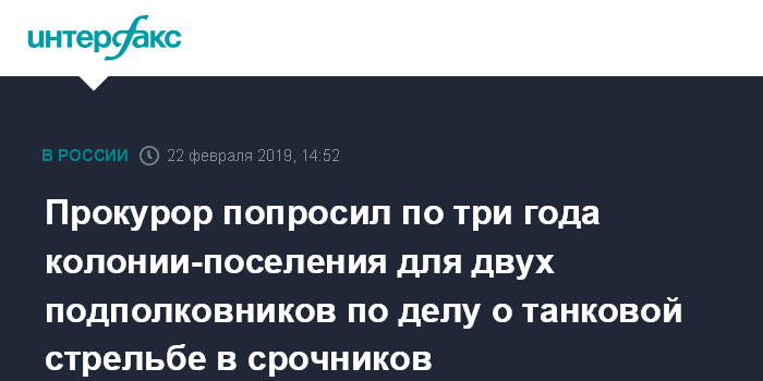 Москва. 22 февраля. INTERFAX.RU - Государственное обвинение попросило приговорить к трем годам колонии-поселения двух подполковников по уголовному делу о гибели рядового и ранении еще трех солдат-срочников в Западном военном округу в результате халатности.