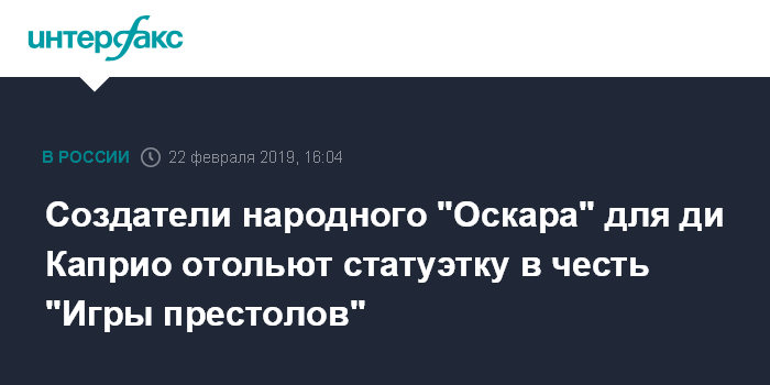 Москва. 22 февраля. INTERFAX.RU - Якутские активисты, которые в 2016 году создали и передали для американского актера Леонардо ди Каприо народный "Оскар", готовят статуэтку для создателей сериала "Игра престолов", сообщила агентству "Интерфакс" организатор проекта Татьяна Егорова.