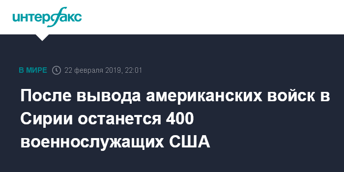 Москва. 22 февраля. INTERFAX.RU - Около 400 американских военнослужащих останутся в Сирии после планируемого вывода военного контингента США из Сирии весной этого года, сообщило в пятницу издание The Washington Post со ссылкой на представителя американской администрации.