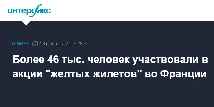 Москва. 23 февраля. INTERFAX.RU - В пятнадцатой акции "желтых жилетов" во Франции приняли участие 46,6 тыс. человек, сообщают в субботу французские СМИ со ссылкой на МВД республики.