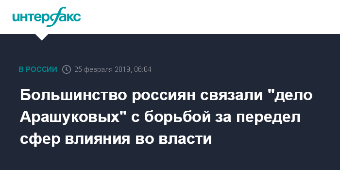 Москва. 25 февраля. INTERFAX.RU - Почти каждый третий россиянин (31%) считает, что задержание члена Совета Федерации Рауфа Арашукова и его отца Рауля Арашукова является проявлением борьбы за передел сфер влияния в высших эшелонах власти, свидетельствуют данные опроса "Левада-центра", поступившие в "Интерфакс".