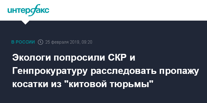 Москва. 25 февраля. INTERFAX.RU - Коалиция экологических организаций обратилась в Следственный комитет России и Генпрокуратуру с просьбой тщательно расследовать пропажу косатки из вольеров бухты Средняя, предъявить отловщикам обвинения в жестоком обращении с животными и передать животных Росприроднадзору.
