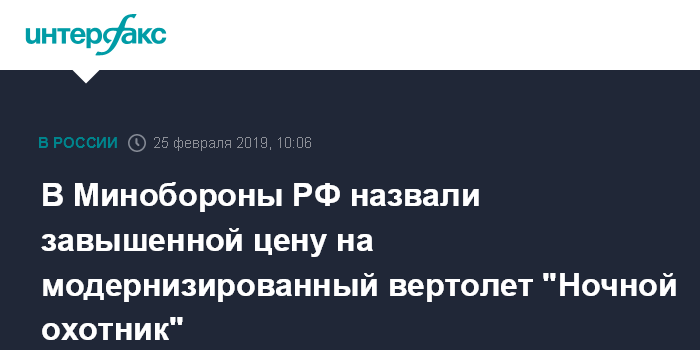 Москва. 25 февраля. INTERFAX.RU - В министерстве обороны России рассчитывают на пересмотр холдингом "Вертолеты России" стоимости модернизированного ударного вертолета Ми-28НМ.