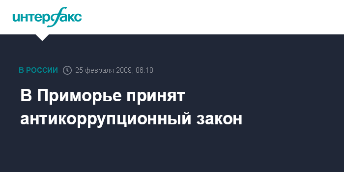 Владивосток. 25 февраля. ИНТЕРФАКС-ДАЛЬНИЙ ВОСТОК - Депутаты Законодательного собрания (ЗакС) Приморья на очередной сессии приняли в окончательном третьем чтении закон "О противодействии коррупции в Приморском крае". В ближайшее время новый закон начнет действовать.
