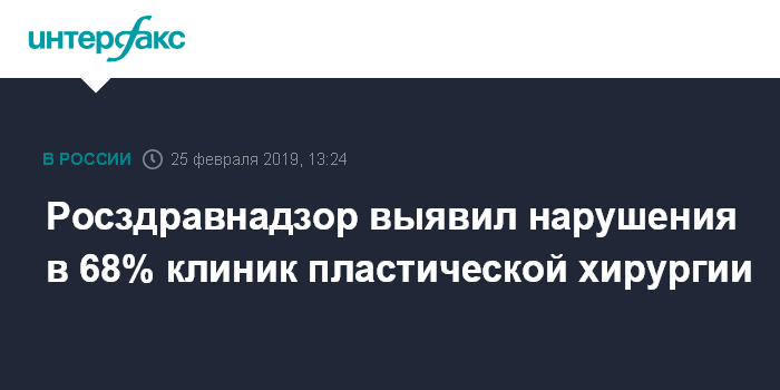 Москва. 25 февраля. INTERFAX.RU - В большинстве клиник пластической хирургии, оказывающих услуги на территории России выявлены нарушения, говорится в сообщении Росздравнадзора в понедельник.