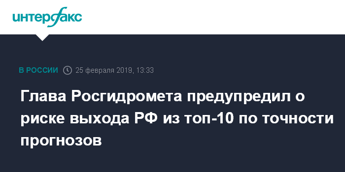 Москва. 25 февраля. INTERFAX.RU - Глава Росгидромета Максим Яковенко заявил, что отсутствие достаточного финансирования на метеообеспечение в стране и ускоряющееся технологическое развитие в мире могут привести к тому, что Россия, некогда лидер в мире по точности и качеству прогнозов, может опуститься ниже десятого места.