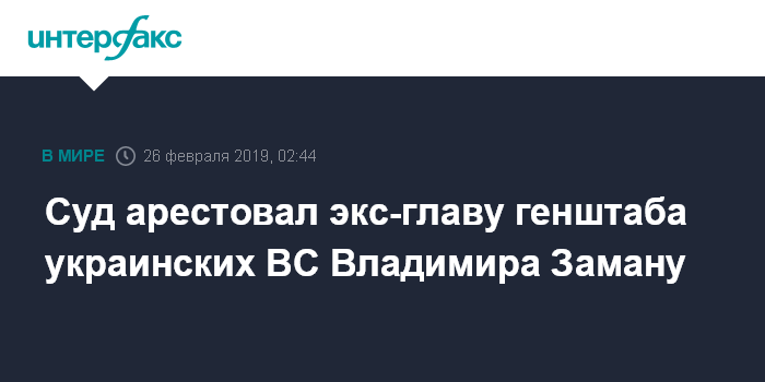 Москва. 26 февраля. INTERFAX.RU - Печерский районный суд Киева в ночь на вторник принял решение взять под стражу сроком до 27 марта без альтернативы залога бывшего начальника Генерального штаба Вооруженных сил Украины Владимира Заману, подозреваемого в государственной измене.