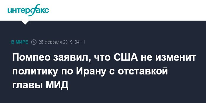 Москва. 26 февраля. INTERFAX.RU - США не изменят свою политику по отношению к Ирану независимо от того, уйдет ли в отставку иранский министр иностранных дел Джавад Зариф, заявил госсекретарь США Майк Помпео.