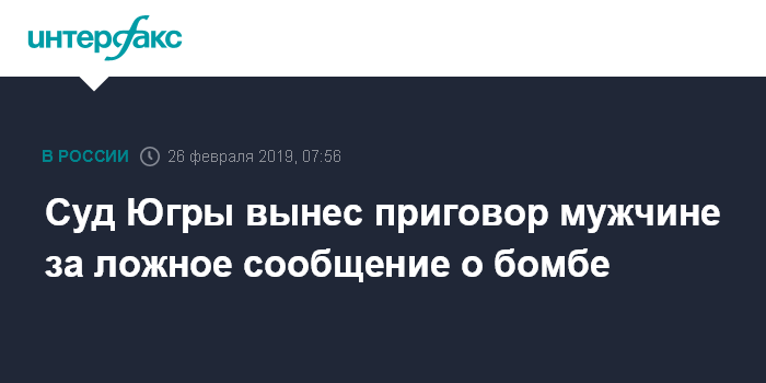 Москва. 26 февраля. INTERFAX.RU - Суд вынес приговор мужчине, который сообщил работникам аэропорта в Сургуте о бомбе в его ручной клади, сообщает во вторник пресс-служба Уральской транспортной прокуратуры.