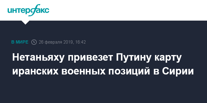 Москва. 26 февраля. INTERFAX.RU - В ходе встречи премьер-министра Израиля Биньямина Нетаньяху в среду в Москве с президентом РФ Владимиром Путиным российской стороне будет представлена карта иранских военных позиций в Сирии, сообщили во вторник израильские СМИ со ссылкой на окружение главы правительства.