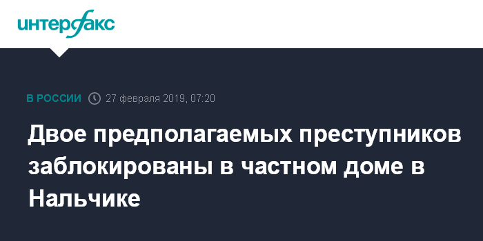 Москва. 27 февраля. INTERFAX.RU - Два человека, оказавшие вооруженное сопротивление сотрудникам правоохранительных органов, находятся в частном доме на территории проведения контртеррористической операции (КТО) в Нальчике, сообщил агентству "Интерфакс" информированный источник в среду.