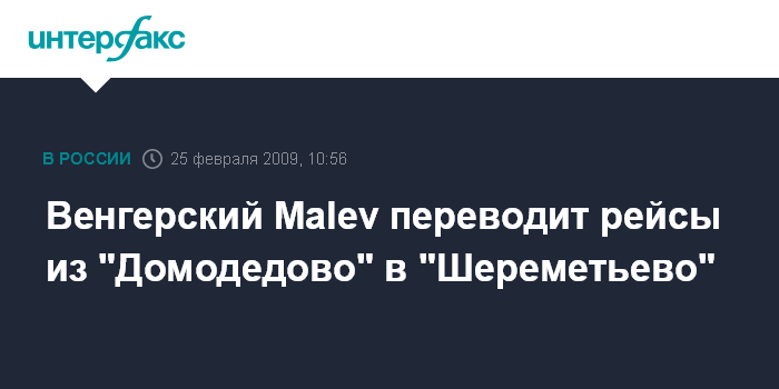 Москва. 25 февраля. INTERFAX.RU - Венгерский национальный перевозчик Malev с летнего сезона 2009 года переводит свои рейсы из московского аэропорта "Домодедово" в "Шереметьево", говорится в совместном пресс-релизе Malev и АО "Аэрофлот - российские авиалинии".
