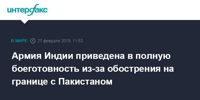 Москва. 27 февраля. INTERFAX.RU - Армия и пограничники Индии находятся в полной боевой готовности в связи с эскалацией напряженности в отношениях с Пакистаном, сообщает в среду газета The Times of India.