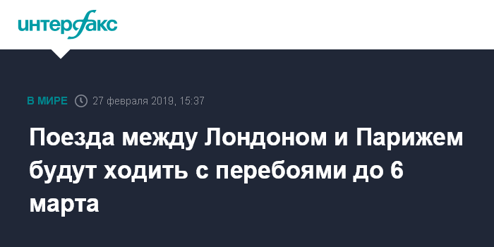 Москва. 27 февраля. INTERFAX.RU - Поезда Eurostar между Лондоном и Парижем из-за технических проблем будут ходить с перебоями до 6 марта, сообщает в среду ситуационно-кризисный центр (ДСКЦ) МИД РФ.