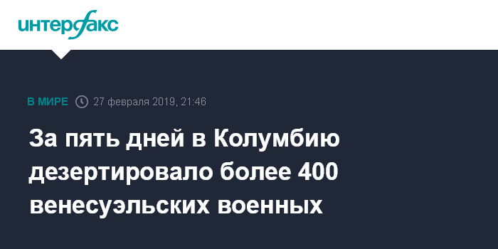 Москва. 27 февраля. INTERFAX.RU - По меньшей мере 411 венесуэльских военнослужащих дезертировали в Колумбию за последние пять дней, из них не менее 85 за - последние сутки, передает в четверг агентство EFE со ссылкой на источники в колумбийском руководстве.