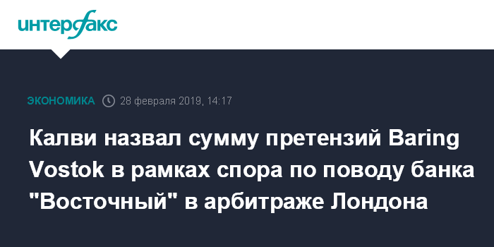 Калви назвал сумму претензий Baring Vostok в рамках спора по поводу банка "Восточный" в арбитраже Лондона