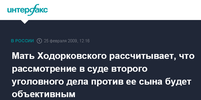 Москва. 25 февраля. INTERFAX.RU - Марина Ходорковская, мать экс-главы ЮКОСа Михаила Ходорковского надеется на объективность суда при рассмотрении второго уголовного дела в отношении ее сына.
