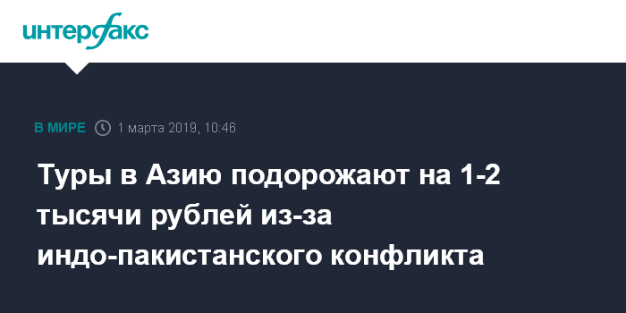 Москва. 1 марта. INTERFAX.RU - Туры в Азию подорожают в пределах 1-2 тысяч рублей на человека, если в ближайшее время не будет снят запрет на полеты над Пакистаном, сообщили "Интерфаксу" в пятницу в Ассоциации туроператоров России (АТОР).