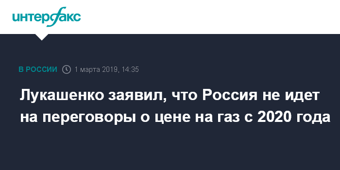 Москва. 1 марта. INTERFAX.RU - Президент Белоруссии Александр Лукашенко утверждает, что российская сторона не реагирует на предложения Минска о начале переговоров о цене на газ с 2020 года.