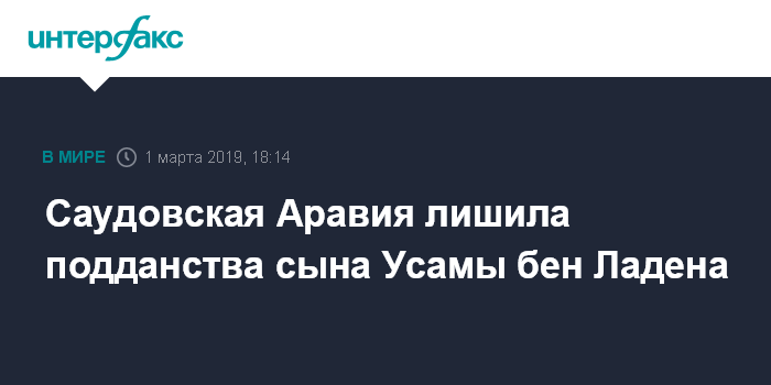 Москва. 1 марта. INTERFAX.RU - Власти Саудовской Аравии лишили подданства Хамзу бен Ладена, сына бывшего лидера террористической группировки "Аль-Каида" (запрещена в РФ) Усамы бен Ладена, сообщает в пятницу агентство Associated Press со ссылкой на официальные СМИ королевства.