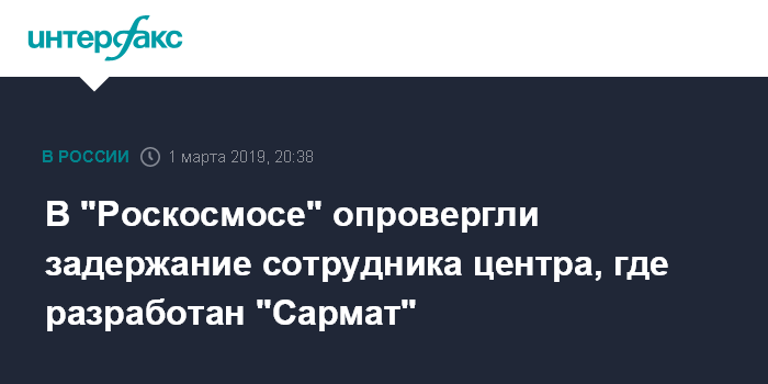 В "Роскосмосе" опровергли задержание сотрудника центра, где разработан "Сармат"