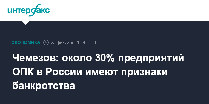 "Финансово-экономическое состояние только 36 стратегических организаций ОПК можно признать устойчивым. Около 30% организаций (от общего количества - "ИФ") имеют признаки банкротства", - сказал Чемезов.