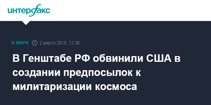 Москва. 2 марта. INTERFAX.RU - США создают предпосылки к милитаризации космического пространства своими намерениями использовать космос в военных целях, заявил в субботу начальник Генерального штаба Вооруженных сил - первый заместитель министра обороны РФ генерал армии Валерий Герасимов на конференции, посвященной развитию военной стратегии.