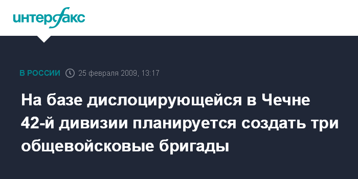 Москва. 25 февраля. INTERFAX.RU - Общевойсковые бригады постоянной готовности планируется создать на базе дислоцирующейся в Чечне на постоянной основе 42-й мотострелковой дивизии, сообщили в среду "Интерфаксу-АВН" в Минобороны РФ.