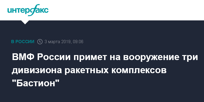 ВМФ России примет на вооружение три дивизиона ракетных комплексов "Бастион"