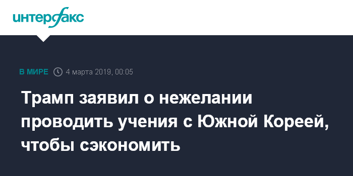 "Причина, по которой я не хочу проведения военных учений с Южной Кореей, заключается в том, чтобы сохранить сотни миллионов долларов, которые нам никто не вернет. Я придерживался этой позиции задолго до того, как стал президентом. А также, снизить напряженность в отношениях с КНДР сейчас - это хорошо", - сообщил он в твиттере в воскресенье.
