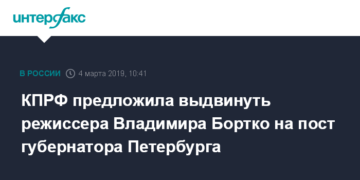 Москва. 4 марта. INTERFAX.RU - Санкт-Петербургское городское отделение КПРФ приняло решение предложить кандидатуру депутата Государственной думы Владимира Бортко к выдвижению на пост губернатора северной столицы, сообщила пресс-служба партии.