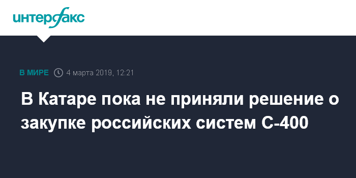 Москва. 4 марта. INTERFAX.RU - Договоренности о приобретении Катаром российских систем ПВО С-400 пока не достигнуто, заявил глава МИД Катара Мухаммад бен Абдеррахман Аль Тани.