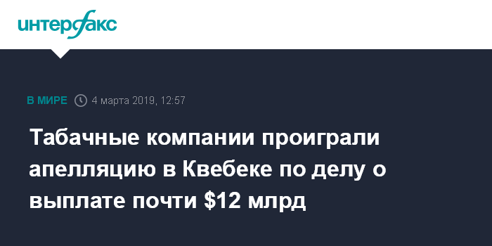 Москва. 4 марта. INTERFAX.RU - Апелляционный суд канадской провинции Квебек поддержал решение суда низшей инстанции и постановил, что канадские дочерние компании международных табачных гигантов British American Tobacco Plc (BAT), Philip Morris International Inc. (PMI) и Japan Tobacco Inc. (JTI) обязаны выплатить жителям провинции 15,6 млрд канадских долларов ($11,7 млрд), пишет MarketWatch.