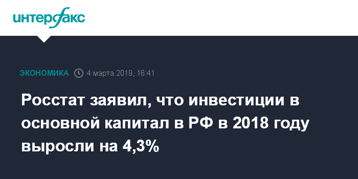 Москва. 4 марта. INTERFAX.RU - Инвестиции в основной капитал в РФ в 2018 году выросли на 4,3%, сообщил в понедельник Росстат.