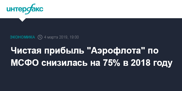 Москва. 4 марта. INTERFAX.RU - "Аэрофлот" в 2018 году снизил чистую прибыль по МСФО на 75% по сравнению с показателем 2017 года, до 5,7 млрд руб., говорится в отчете компании. Консенсус-прогноз "Интерфакса" предполагал чистую прибыль в размере 8,7 млрд рублей.