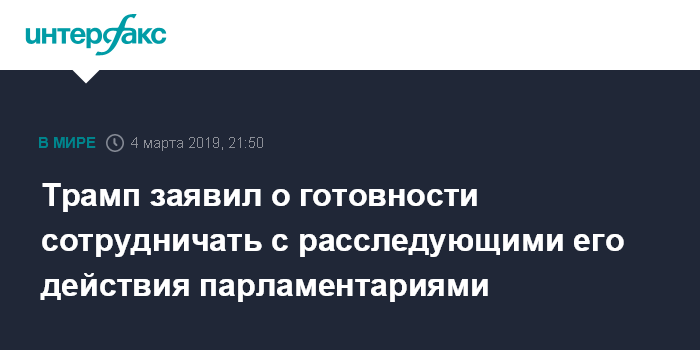 Москва. 4 марта. INTERFAX.RU - Президент США Дональд Трамп в понедельник заявил, что готов сотрудничать с юридическим комитетом Палаты представителей Конгресса, расследующим правомочность действий главы государства и его администрации, сообщает издание The Hill.