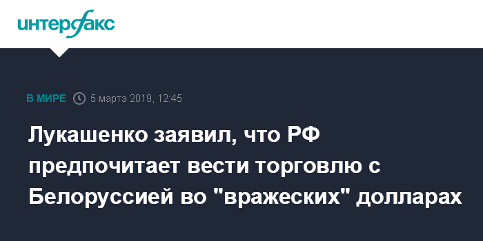 При этом, добавил он, Белоруссия предложила РФ перейти в расчетах во взаимной торговле на российский рубль, но Москву это не устраивает. "Я недавно президенту (России - ИФ) предложил: прежде чем бросаться на что-то большое, давайте перейдем на 100% торговли в российских рублях. Вот наше предложение. Мы этого не боимся, но никто на это не идет. Значит, Россия отказывается от торговли с самым близким своим партнером в российских рублях, рассчитывая на твердую валюту - на "вражеские" доллары и евро", - подчеркнул Лукашенко.