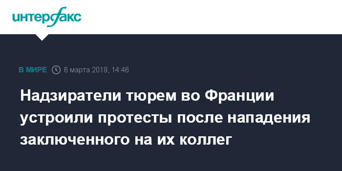 Москва. 6 марта. INTERFAX.RU - В 18 французских тюрьмах в среду утром прошли акции протеста надзирателей после нападения заключенного на двух их коллег в исправительном учреждении в коммуне Конде-Сюр-Сарт, пишет в среду Figaro.