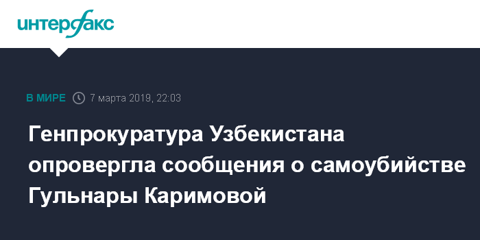 Москва. 7 марта. INTERFAX.RU - Генеральная прокуратура Узбекистана опровергла информацию о якобы самоубийстве дочери экс-президента республики Гульнары Каримовой, распространившуюся в четверг в соцсетях.