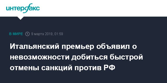 Москва. 9 марта. INTERFAX.RU - Италия работает над отменой санкций ЕС против России, однако в сжатые сроки добиться этого невозможно, заявил в Генуе в пятницу итальянский премьер Джузеппе Конте.