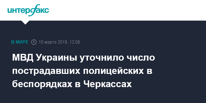 Москва. 10 марта. INTERFAX.RU - В результате столкновений между активистами националистических сил и полицейскими в украинских Черкассах в медицинские учреждения обратились 22 сотрудника полиции, 19 из которых были госпитализированы, сообщили в министерстве внутренних дел.