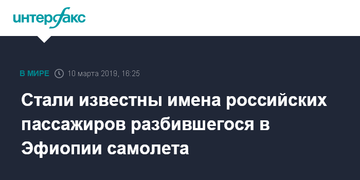 Москва. 10 марта. INTERFAX.RU - Авиакомпания Ethiopian Airlines озвучила имена россиян, находившихся на борту разбившегося в Эфиопии самолета, заявляют в посольстве РФ в Эфиопии.