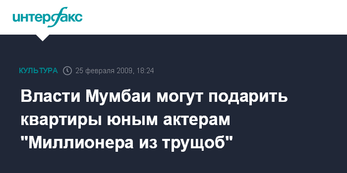 Дели. 25 февраля. INTERFAX.RU - Члены работающей в Мумбаи (Бомбее) ячейки партии Индийский национальный конгресс выступили с предложением поощрить детей, сыгравших основные роли в завоевавшем "Оскара" фильме "Миллионер из трущоб", и подарить им квартиры, сообщает в среду индийский телеканал NDTV.