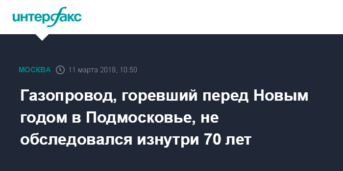 Москва. 11 марта. INTERFAX.RU - Магистральный газопровод в Подмосковье, авария на котором оставила без тепла десятки тысяч человек перед самым Новым годом, не обследовался изнутри на протяжении всего срока эксплуатации - с 1952 года, сообщается в материалах Ростехнадзора.