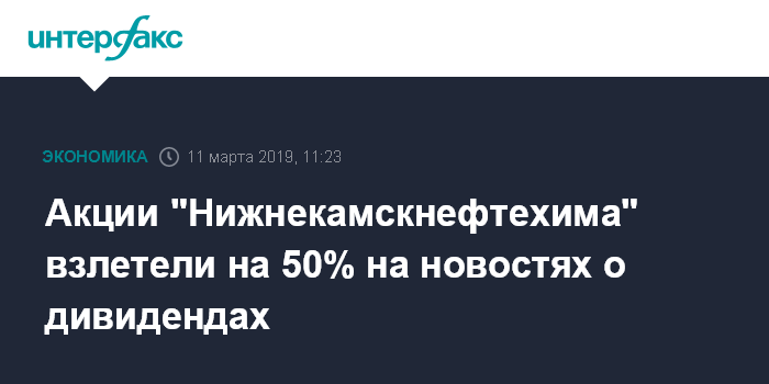 Москва. 11 марта. INTERFAX.RU - Акции "Нижнекамскнефтехима" утром в понедельник взлетели на 50% и обновили максимумы на новостях о рекомендациях совета директоров выплатить акционерам дивиденды за 2018 год в размере 19,94 рубля на акцию.