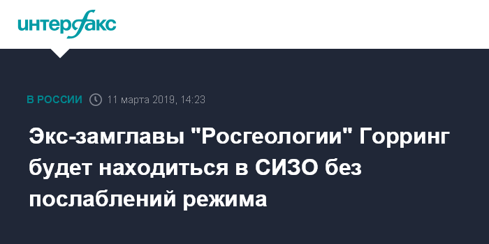 Москва. 11 марта. INTERFAX.RU - Бывший первый заместитель главы "Росгеологии" Руслан Горринг содержится на карантине в подмосковном СИЗО-5, сообщил "Интерфаксу" председатель экспертного совета по безопасности и взаимоотношениям граждан с правоохранительными ведомствами, глава подмосковного ОНК Антон Цветков.