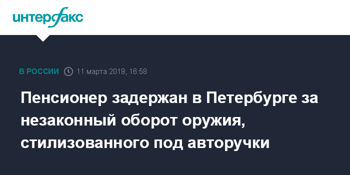 Москва. 11 марта. INTERFAX.RU - Сотрудники правоохранительных органов задержали в Петербурге 75-летнего мужчину за хранение стреляющего боевыми патронами оружия, стилизованного под авторучки, а также переделанных под боевое оружие сигнальных ракетниц.