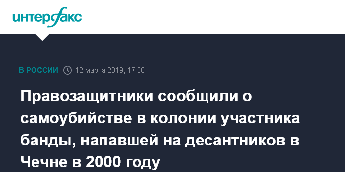 Москва. 12 марта. INTERFAX.RU - Заключенный исправительной колонии номер 6 во Владимирской области Аюб Тунтуев, который являлся участником банды, напавшей в 2000 году на военнослужащих в Чечне, покончил жизнь самоубийством, сообщила в фейсбуке Ксения Бабич, представитель фонда "Правовая инициатива", который занимается нарушениями прав человека на российском Кавказе.